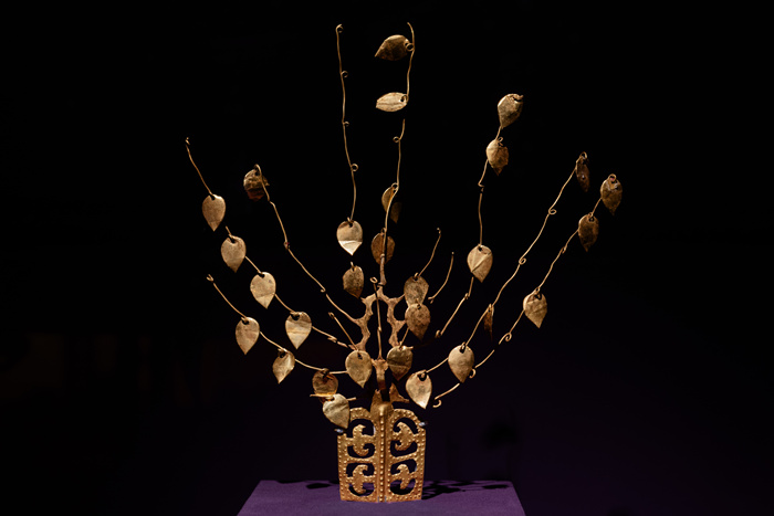 展覽中的亮點之一是一系列金步搖,金步搖在佩戴者行走時隨步搖曳,閃閃發光。這種名為“步搖”的花枝狀冠飾源于西域并通過絲綢之路傳入北方地區,在遼西地區流行,并成為三燕文化的典型器物。