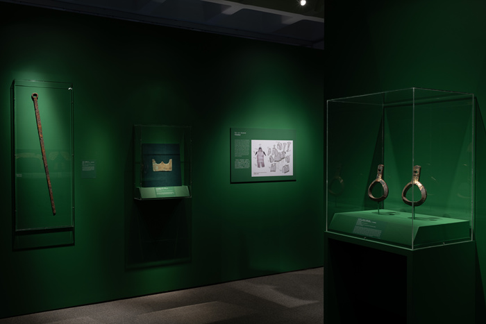 “龍城之金”特展第四展廳馬鐙、長刀、及山形箭菔飾,2024,華美協進社中國美術館