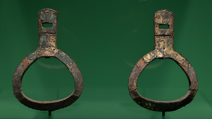 展覽還展示了目前所知最早的一對馬鐙。馬鐙的發明,改變了騎兵和戰爭的方式,使得騎兵戰士將雙腳踏入馬鐙后,便可騰出雙手用于戰斗。這對出土于馮素弗墓中的馬鐙由富有韌性的桑木和鎏金青銅飾片制成,代表了十六國時期北燕的鎏金工藝和馬鐙制作水平。發明馬鐙的重要性,一如歷史學家羅伯特·坦普爾在其著作《中國:發明與發現的國度——中國科學技術史精華》(Inner Traditions, 2007)所述:“當我們想到中世紀的歐洲時,我們會想到身穿鎧甲、手持重矛的騎士,但沒有馬鐙,這些沉重的騎士很容易從馬上跌落。正是中國發明的馬鐙使得西方中世紀騎士成為可能,并帶來了騎士精神的時代?!?/p>