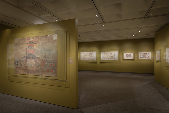 “龍城之金”特展第二展廳“樓閣圖”與“最后的四神圖”“金烏圖”,2024,華美協進社中國美術館
