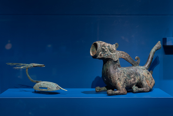 展覽中還展出了從馮素弗(415年去世)墓中出土的一件青銅虎形器。這件青銅器頭高尾翹,細致的鑄造紋飾展現了老虎的毛發,可能作為飲器或容器使用。這一罕見的文物展示了南北文化的融合。