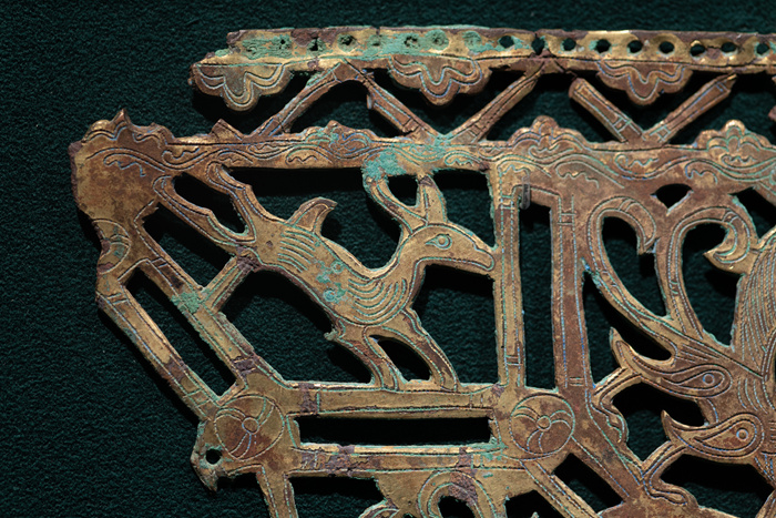 “龍城之金”特展第四展廳鎏金銅鏤空鞍橋飾片奔鹿紋特寫,2024,華美協進社中國美術館