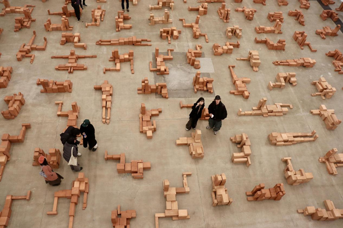 第?種視?是?常獨特的,我之前在倫敦做過?次這個展覽,展示過?次這些作品,但是當時我沒有這樣?個條件,從上空向下俯瞰。實際上從上向下俯瞰的時候,我們可以更清晰地看到作品跟作品之間的?個關系。我們會看到整個作品,他們是很多個?形的結構,組成在?起就像是?個迷宮?樣。每個?形的雕塑?概是由 26到 30塊的紅磚組成,?共是 132座?形的雕塑,我把它們叫做“body building”。但其實這??最重要的還不是這些作品本身,?是觀眾。我們的展覽會邀請觀眾??其中,他們會穿過?個很?的?,所以不能是?群?進?,只能是?個?,以?個獨?的身份去?進迷宮,去尋找??的道路。讓有感受、有思想的?體和這些作品產?互動,那個瞬間藝術才真正的產?。?邊是我們移動的、思考的、感受的、活著的?,另?邊是這些來?于粘?、來?于?地所燒制的磚所形成的藝術作品。據我所知,北京作為中國的?都,磚這種媒介的糾結和歷史是最有延續性的,可能也是世界上最?的。所以說我認為我們這個世界,它的意義的產?實際上是出?于有思考、有感覺的?體和我們周圍?然界這些?然元素產?互動的那個瞬間。