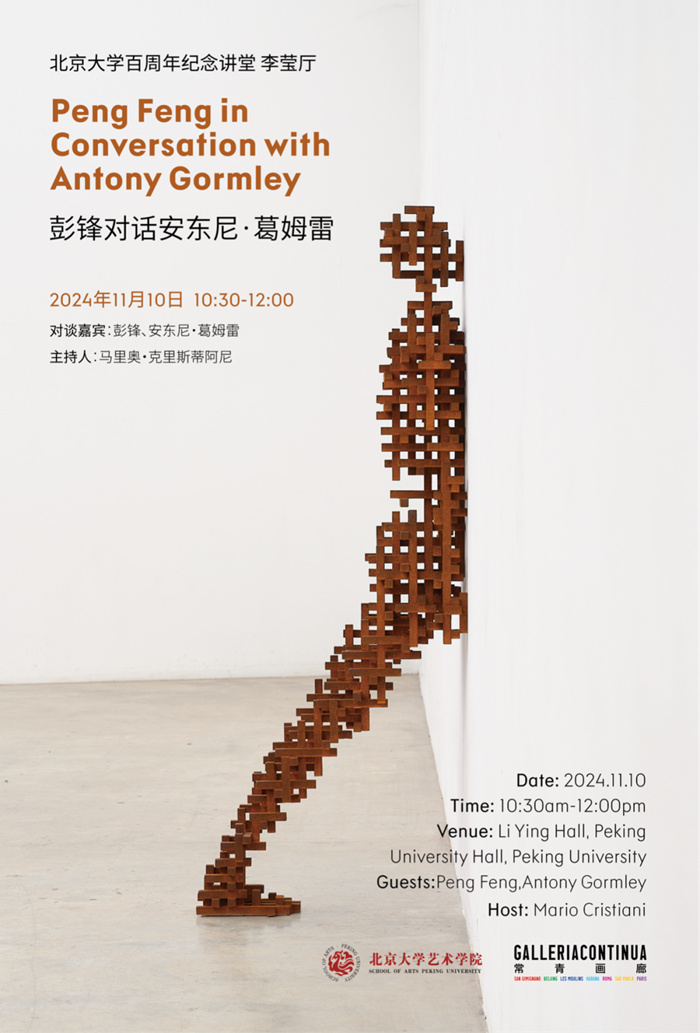 2024年11月10日,安東尼·葛姆雷與彭鋒對談于在北京大學百周年紀念講堂舉行,在這場對話中,當代藝術家安東尼·葛姆雷與北京大學藝術學院院長彭鋒教授探討了藝術、身體與空間之間的復雜關系。安東尼·葛姆雷的雕塑作品以其對人體與空間關系的獨特詮釋而著稱,他在對話中強調了藝術作為一種介入想象力和反思的媒介,其核心在于與觀眾建立深層次的互動,并分享了如何通過作品激發新的行為和思考方式,創造出一個讓人們得以冥想和反思的開放空間。彭鋒教授與藝術家探討了觀看作品“休憩之所”的更多視角還提出藝術如何成為現代生活中平衡工作與休息的一種方式,即藝術如何在快節奏的現代生活中為人們提供心靈休憩的可能性。