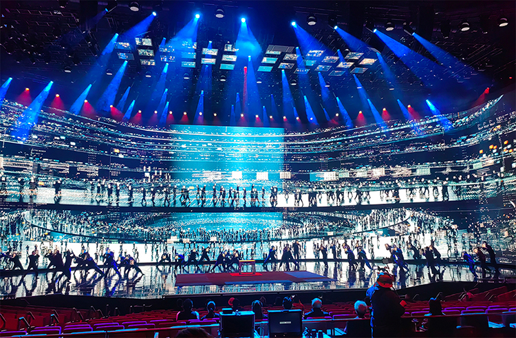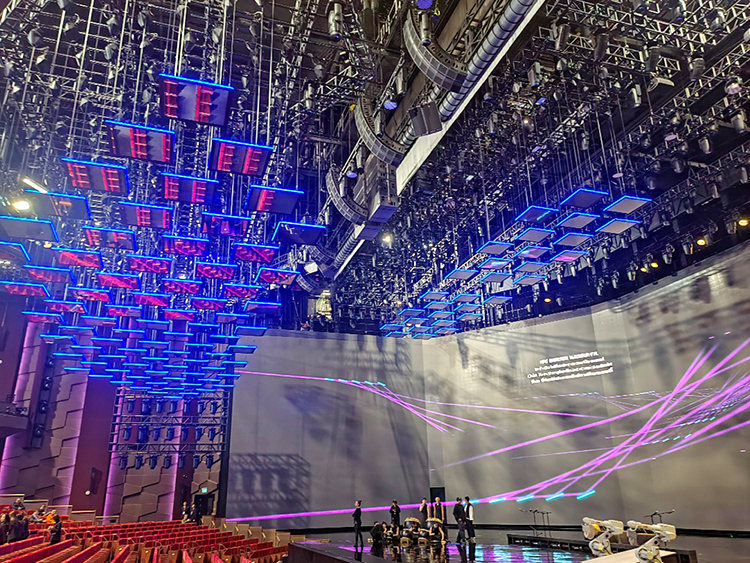 “面條幕”的設計同樣代表著一項重要的技術突破?!懊栏呙穭≡何枧_高度較大,常規幕布需要達到11米的高度,這勢必會對前排觀眾造成視覺壓迫?!被谶@一考慮,執行總導演何璐璐提出了創新性的“面條幕”概念。趙曉宇進一步解釋道:“經過系統論證,我們采用了精確的分割設計——將傳統幕布改造為寬度為0.3米、間隔0.01米的條狀結構。這1厘米的間距是通過嚴密計算確定的,既確保了升降軸承的順暢運行,又完美保持了整體視覺效果?!?/p>