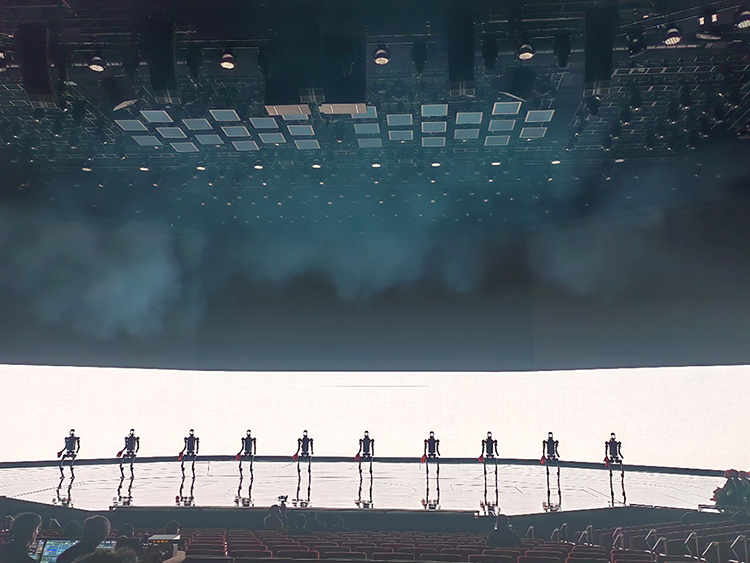 “首先把原有舞臺F區和E區沉降下去,空出約5.4米高的空間,在此空間開發設計了一套完整的隱藏式機械系統。所有設備都精確地藏于舞臺地板下,再根據節目需要進行靈活調度。僅在4月至8月間,舞美設計方案就經歷了多輪重大調整?!壁w曉宇回憶道,“張藝謀導演始終保持著敏銳的創作思維,往往一天之內就能提出數個創新構想。每個新要求都促使我們重新思考設計方案?!?/p>