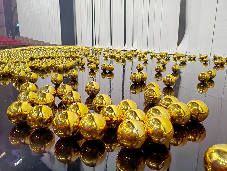 演出壓軸的金球雨特效,凝聚了團隊大量的技術攻關努力?!斑@些看似簡單的金色球體,實際上需要滿足多項嚴格技術指標?!壁w曉宇介紹道,“為此,我們在東莞市三家專業工廠進行了持續性實驗。每個球體都必須同時具備防火性能、光澤通透度和適度彈性。最大的技術挑戰在于重量控制——必須將每個球體的重量精確控制在10克以內,因為在6萬個球體同時釋放的情況下,微小的重量偏差都可能導致整體效果的顯著變化?!?/p>