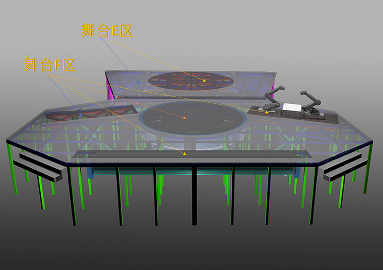 “這臺演出,機械裝置的設計核心在于實現雙重目標:完美的功能性和絕對的隱蔽性?!壁w曉宇強調道,“以E區升降臺為例,在靜態時必須與舞臺完美融為一體,而在演出時又能穩定承載演員表演。同樣,F區的車臺系統在待機狀態下與舞臺表面嚴絲合縫,啟用時則能執行精準的多維度動作。這些技術要求都需要達到極高的工程精度標準?!?/span>