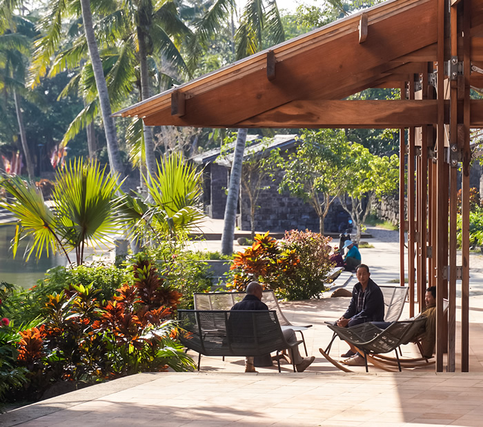 汽車行至那雅村村口時,首先映入眼簾的是圍欄內一群活潑的大白鵝,大鵝的叫聲此起彼伏。路邊田地里大片油亮的辣椒苗正茁壯成長,遠處方綿不絕的樹林勾勒出一派寧靜的田園風光。換乘旅游車深入村中,那雅村的公共活動區的中心是一座古魚塘。湖岸邊幾棵高大的椰樹迎風而立,椰林后方是一片新改造的建筑群,包括會客廳、餐廳、民宿和辦公區域等。其中,高大的會客廳尤為引人注目。它采用榫卯新木結構支撐,纖細的鋼索穿插其間,半透明的陽光板和敞開的落地門設計,讓建筑整體散發出亞熱帶建筑特有的通透與輕盈之美。
