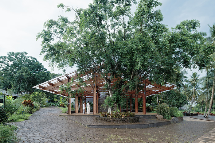 葉曼: 這個項目在龍吉古村,位于瓊北火山巖古村帶澄江邁嶺的龍頭上,村東南角的臺地上的“通德堂”和“將興公祠”為明清建筑,是用火山巖壘砌的,展現了瓊北精湛的石雕、木雕、灰作等建筑工藝。最初我們想修舊如舊,但效果都差強如意。在有限的工期和預算內,難以買到合適的木材,做出一樣的石雕,從而“修舊如初”。后來我們想到以“為老祠堂加冕”的理念,為“通德堂”“將興公祠”兩個祠堂遺址建造一個淺基礎的遺址遮護的構筑物,將祠堂廢墟變成了遺址展廳,保留了祠堂原始風貌和大榕樹,新增的玻璃頂像大傘一樣為遺址遮避雨水,78 根海南名木“坡壘”形成柱陣,由鋼索拉結為一個柔性而穩定的張拉結構體系,可在海島臺風之中守護老祠堂的周全。整個建筑外觀頂部是體現當地精細的玻璃頂,下面是滄桑古老的火山巖老建筑遺址。這仿佛是海南當代文化的寫照——從古樸到現代化的穿越與碰撞。我們認為這個項目是對海南本島“文脈延續與創新”的一次反思與實驗。