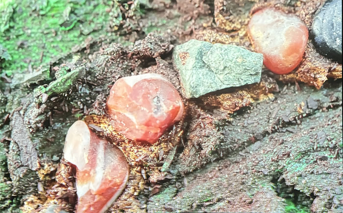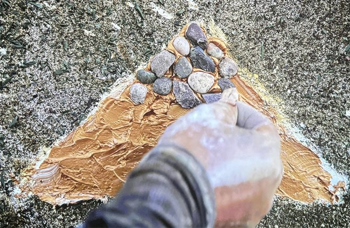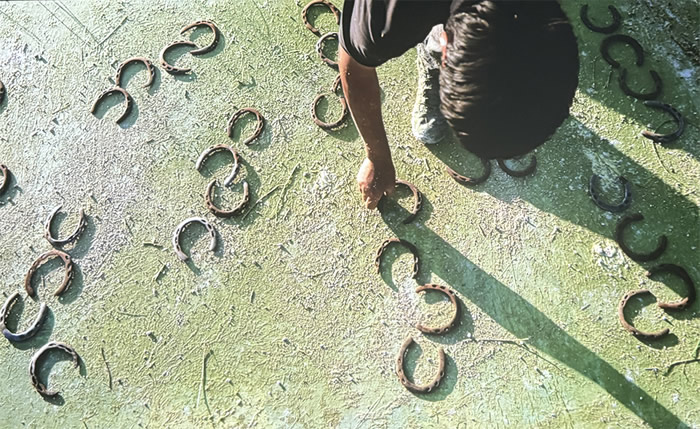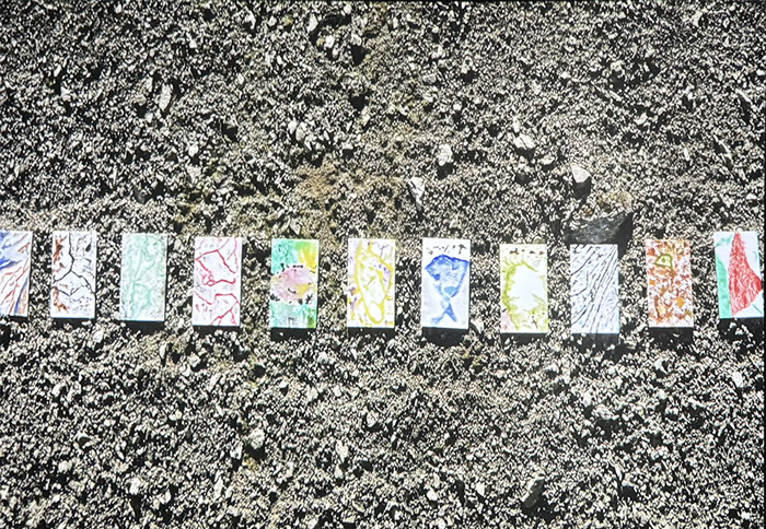 尤為觸動筆者的是藝術家對荒野的細微感知與表達。影片的一處細節是藝術家將彩色石子黏在顏料中,形成特定的形狀,仿佛是某種神秘的自然儀式?;囊耙彩浅錆M能量和信息的場域,各種生物的留痕構成某種符號信息流,他將馬蹄鐵粘貼在沙土肌理的畫面上,仿佛是馬兒奔跑留下的痕跡;劉商英還學習哈薩克牧民羊毛氈的工藝,用細樹枝抽打羊毛,再經過剪、染、鋪、滾羊毛等工藝流程,創作出《太陽的影子1號》。