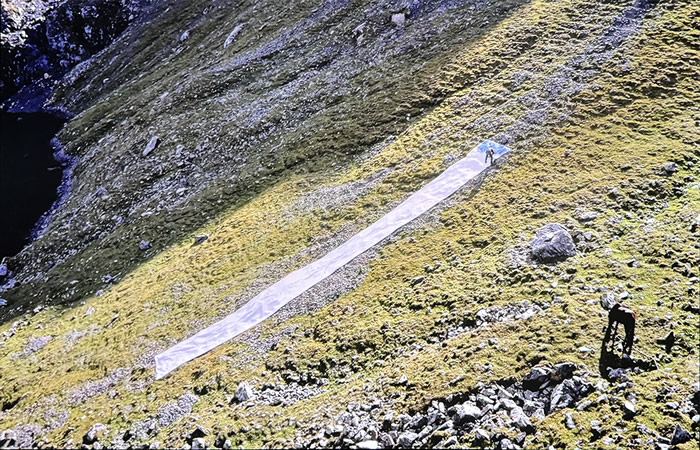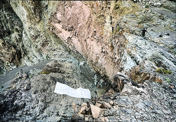 荒野不僅是劉商英創作的天然工作室,也是展覽的現場。影片中有一幕震撼的場景,無人機慢慢飛過山峰,遠遠拍到高山湖邊一字排開的畫作,與對岸那幅長長的藍色亞麻布作品遙相呼應,在雄渾的高山和碧綠的湖水映襯下,這種展陳方式更像是對自然倫理的遵從,充滿對荒野的禮贊和回饋,對自然的敬畏與致敬。