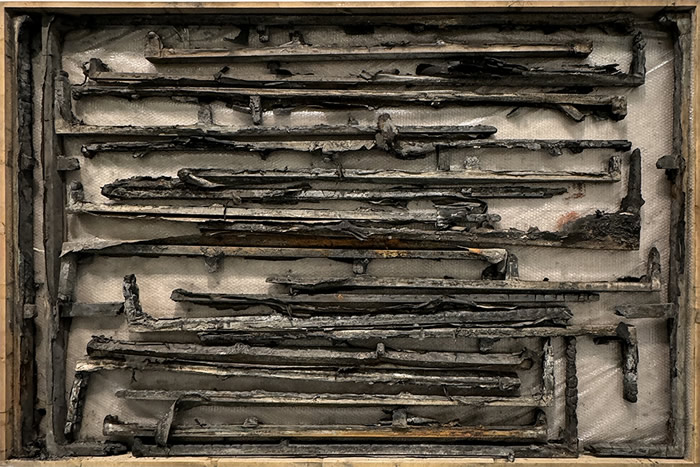 時隔八年,劉商英決定用這些被毀的作品的殘骸,重新創作出新作品《無題》。其中一件作品原畫僅剩黑炭般的畫框,樹脂封印其上,宛如封存在琥珀中的化石。藝術家在上面描繪了封閉圓與開口圓的符號,似乎在表達對萬物輪回轉化的思考,象征著生命、創作與自然的永恒循環。
