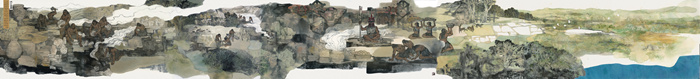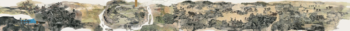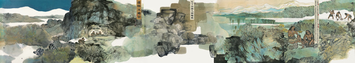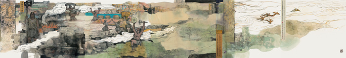 《萬古長歌·湖南史前文明圖卷》歷經兩年創作完成,并邀請國內書法、繪畫名家為作品題跋。作品長140米、高1.8米,氣勢磅礴,思接萬載,由“最早的湖湘先民:逐水而行與狩獵”“從山崗到平原:人類文化發展萌芽”“彭頭山:稻作農業與定居”“高廟:綻放認知與信仰之光”“城頭山:稻作農業走向成熟和城的誕生”“雞叫城:澧陽平原上的古國氣象”“孫家崗:聆聽華夏浪潮之聲”等七個部分構成,堪稱湖湘畫壇上的鴻篇巨制。