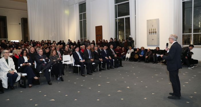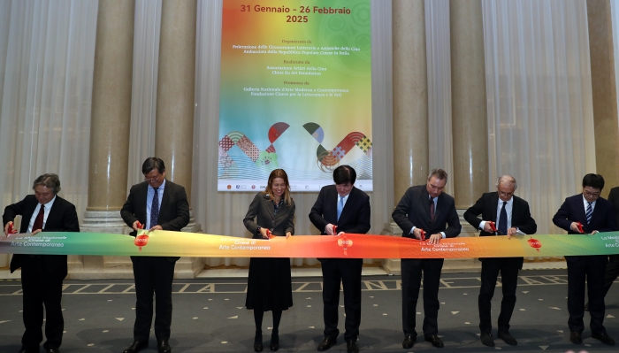 1月31日,當中國沉浸在農歷蛇年新春佳節的喜慶氛圍之際,位于意大利羅馬的國家現當代美術館同樣氣氛熱烈。作為慶祝中意建交55周年和中國文聯2025“今日中國”藝術周系列活動之一,由中國文聯、中國駐意大利使館主辦,中國美術家協會、中歐藝術基金會承辦的中國當代美術作品展覽在此開幕。中國文聯黨組書記、副主席李屹,中國駐意大利使館臨時代辦李小勇公參,意大利國家現當代美術館館長馬贊蒂尼,意大利外交部公共和文化外交總司長德·佩迪斯,中國美協副主席馬鋒輝,中國文聯國際聯絡部主任于海琳,中國視協分黨組書記閆少非,中國美協分黨組成員、秘書長王平,江蘇美術館副館長欒劍,清華大學美術學院雕塑系副系主任、副教授馮崇利,中歐藝術基金會主席王圣文,以及意大利博爾蓋塞博物館、國立二十一世紀藝術博物館、安德森博物館、國際女藝術家聯合會、羅馬美術學院、意大利托斯卡納文化協會、意大利國家科學院等當地重要文化機構負責人和各界代表、觀眾、媒體百余人出席開幕式。意大利著名藝術史學家、羅馬美術學院教授西蒙基尼擔任主持。