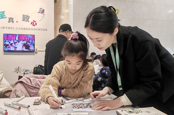 此外,結合41米層藝術教育長廊的“我心中的敦煌”繪畫作品展、“至真·致心”——致敬大師·《赤子冠中》少兒繪畫創作活動優秀作品展,初五的兩場創意活動靈感四射?!岸鼗途_夢”水墨數字繪畫共創活動將傳統與現代完美結合,觀眾們在數字繪畫的世界里,用現代科技手段創作出了獨一無二的敦煌藝術作品?!冻嘧庸谥小访烙瘯沧x共繪活動則讓孩子們在閱讀中汲取靈感,用畫筆描繪出自己心中的灰、白、黑世界,充滿了童趣與想象力。