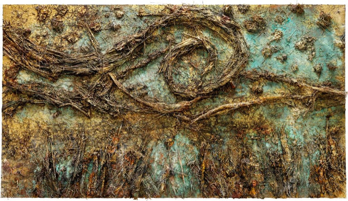 安塞姆·基弗,《星夜》,2019年,乳劑、油、丙烯酸、蟲膠、稻草、金箔、金屬絲、布面電解沉淀物,470x840cm,照片來源:Georges Poncet。