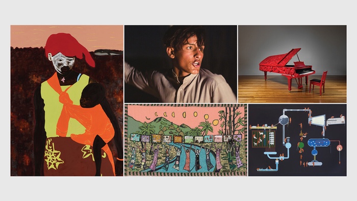從左至右依次為:Cassi Namoda:《Kala vanga heti》,2024年,出自“Carapau in the deep abyss,” 2024年,由藝術家和布魯塞爾的Xavier Hufkens提供;Alia Farid,《Chibayish(靜物)》, 2023年,圖片由藝術家提供;Michael Parekōwhai,《He Kōrero Pūrākau mo te Awanui o Te Motu: Story of a New Zealand river》,2011年,新西蘭Te Papa Tongarewa博物館藏;Akira Ikezoe,《Bears on the Diagram of Chernobyl Nuclear Power Plant》,2021/2024年,圖片由藝術家提供;Güne? Terkol,《Gori Leso Leso》,2024年,圖片由藝術家提供。