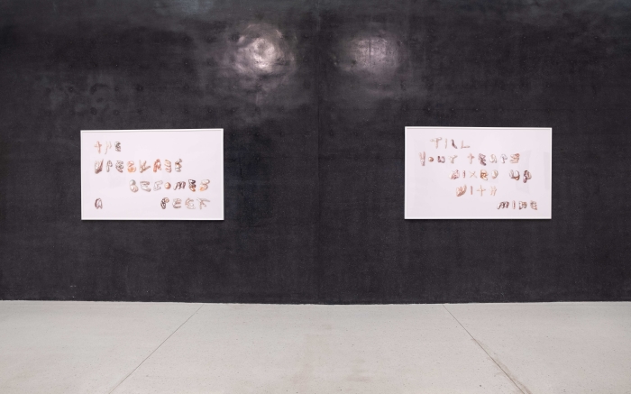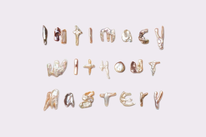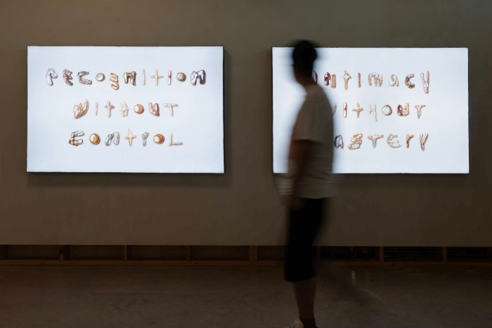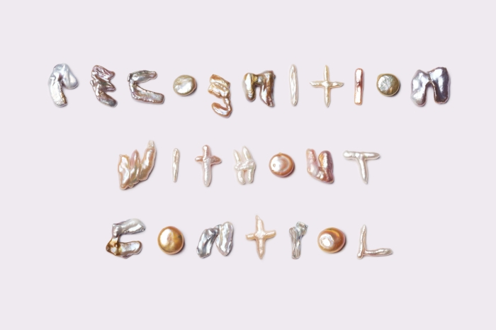 珍珠字母拼成的短語“Recognition Without Control”展示了馮吳超如何將畸形珍珠重新排列成字母,形成一種“珍珠語言”。她將養殖中視為次品的畸形珍珠收集起來,按字母形狀進行編排,拼組成英文短語,使材料本身成為文本。這些短語如“無控制的識別”(Recognition without Control)和“無掌控的親密”(Intimacy without Mastery)等,傳達出女性經驗中對身份認同和親密關系的復雜感受。所謂“珍珠語言”,本質上是一種創傷語言:當口語文字無法充分表達隱秘的痛感時,藝術家讓物質替她書寫。珍珠生成于貝類身體的防御反應,其形狀和紋理本身便帶有“身體語法”;而將珍珠排列成字母,則進一步把身體經驗翻譯為一種物質文字。馮吳超強調“語言是由材料自身產生的”,“材料會‘發出’語言”,仿佛語言早已嵌在珍珠的細胞結構之中。這種由材料迸發的語言超越了對完美與缺陷的拘泥,將個人沉默的經驗轉化為一種可被閱讀的物質敘事。