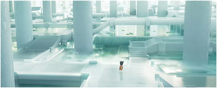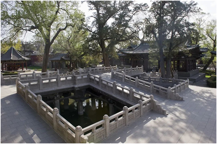 玉虛宮仙池的樓梯和方形荷塘則借鑒了山西晉祠的“魚沼飛梁”?!棒~沼飛梁”是中國最早的水陸立交橋,始建于北魏之前,現存基本上為宋代形制。魚沼,意為圓形水池,飛梁指的是沼上的十字形橋梁,“魚沼飛梁”包括石柱、斗拱、木梁、欄桿、望柱、鐵獅等部分。片中將所有建筑改為玉的材質,營造玉虛宮潔白神圣的氛圍。