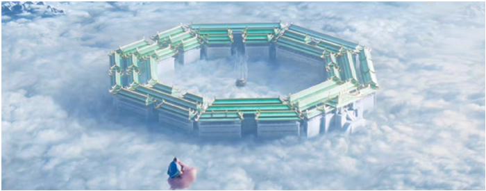 位于昆侖山的闡教仙門重地玉虛宮為多個單體所構成的八邊形院落式建筑群,由九宮八陣演變而來,與陜西漢中天師堂建筑風格類似。天師堂為道教圣地,最早由東漢時期的漢中王張魯所建,以視覺呈現了道教的八卦哲學觀。