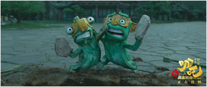 在前作《哪吒之魔童降世》中,已融入大量中國文物元素,例如哪吒出生時,太乙真人使用了近似馬家窯文化漩渦紋彩陶罐飲酒;而哪吒三歲生日宴上,出現了商周時期的觚(飲酒器)與鐃(樂器),樂隊演奏的場景也與唐三彩駱駝載樂俑極為相似。而在《哪吒之魔童鬧?!分?,中華傳統元素更是被巧妙地滲透至每一個細節,使影片呈現出濃厚的東方美學韻味。