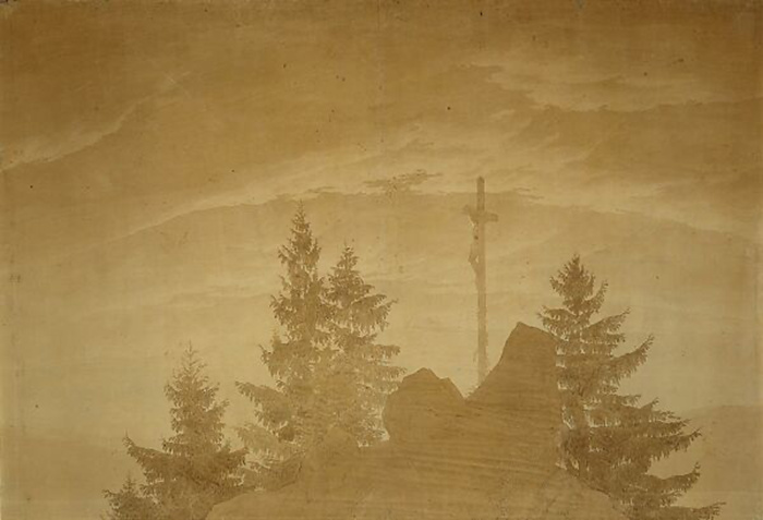 立于風景中的十字架一直是他經常繪畫的題材。本次展覽中展示了他最早的一件以十字架為中心的作品:1806年的《山中十字架》。這件作品采取一種極簡主義的形式,描繪了立于巖石上的十字架,全部是單色的,十字架和巖石幾乎只有輪廓和其中棕色的陰影,巖石背后的云層里渲染了柔和的光暈。無論信仰為何,人們都能在這件作品中感受到一種令人震撼的精神。
