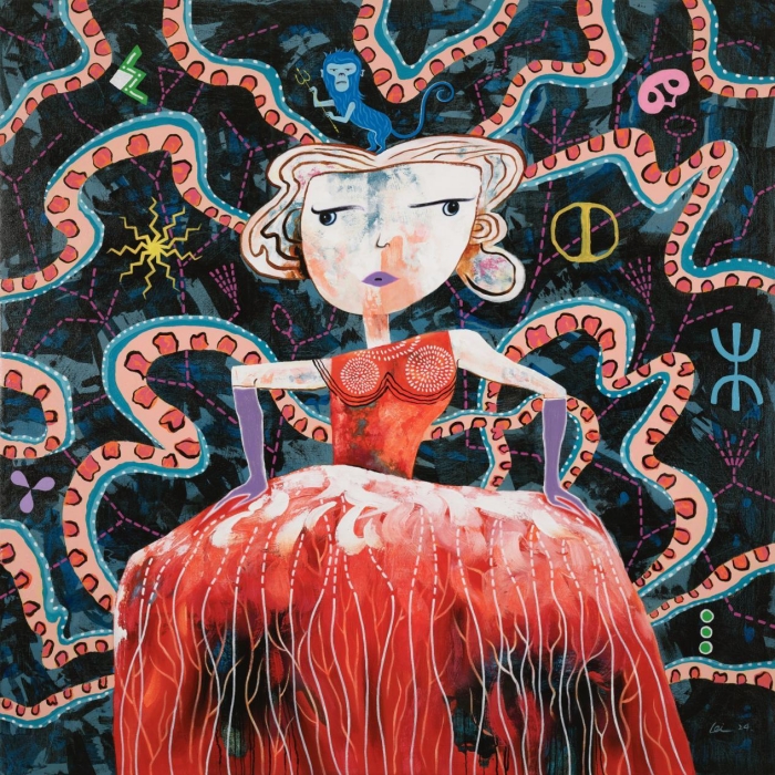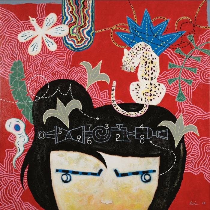 《數字女孩》,布面丙烯及綜合材料,150x150 cm,2024(選送Art Central 2025 陳雷個展現場作品之一)
