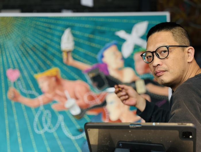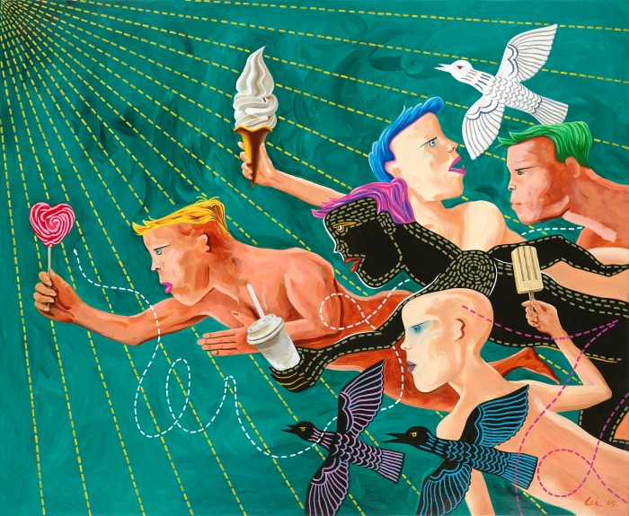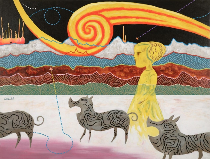 閱盡千帆,再度歸來。隨著年齡閱歷的增長,陳雷的畫面褪去冷峻、嚴肅,愈發呈現出一種平易、輕松與幽默,在這些高飽和的色彩和豐富的圖像符號上,承載著極高品質的藝術形式語言。而在輕松坦蕩的表象之下,恒久不變的是犀利與深刻,撩撥觀者的心田。2024年以來,陳雷的作品先后在798國際藝術中心、中央美術學院美術館、艾利艾智庫、韓建美術館、萃島畫廊等展出,觀者熱烈地交談、留言,發自內心的喜歡、收藏,甚至有很多孩子饒有興趣地坐在地上觀看和臨摹,這與一向被吐槽“看不懂”的當代藝術形成鮮明的反差,成為值得探究的現象。