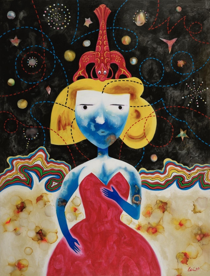 似乎是天生的想象與創造力,在陳雷的畫作里充滿了千變萬化的形象與符號。男人、女人、動物、植物……這些通俗易懂的形象被他奇異地組合在畫面中,不斷地讓觀眾產生新的思考。在互聯網時代,那些來源于古今中外人類文明的符號,被他拿來置于畫面中,隱藏著解讀畫面的關鍵信息。讀者雖然無法準確言傳,但憑借共同的文化記憶,可以心領神會。隨著創作的深入,陳雷逐漸形成了他的形象與符號話語體系。比如,人物與動物的組合。畫面中,一名女性與馬、狗、猴、甚至龍蝦……相比于復雜的人類,動物無疑是單純的存在,在這種組合中,我們似乎看到了一種包容與共生的關系。在主體之后的背景中,往往出現莫名其妙的線,打破原有的結構,讓空間更為復雜,宛如迷宮;有趣的是,他的筆下也逐漸誕生出屬于自己的獨特符號,例如“花瓣鳥”,象征著溫情與美好,在畫面中翩翩起舞。