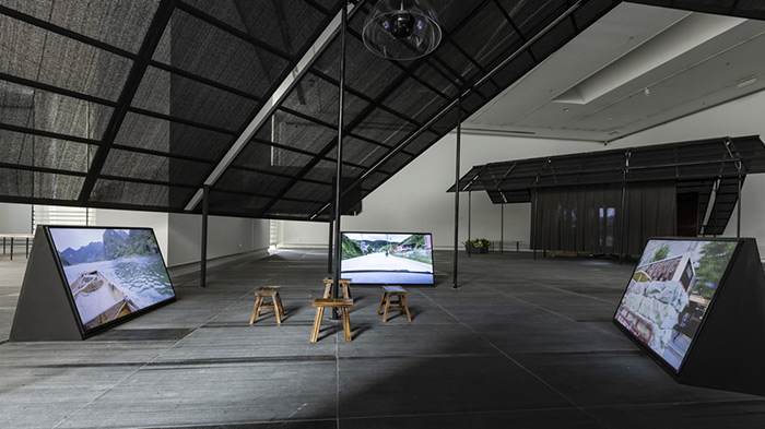 生活于美國的人類學家邱垂珍的研究聚焦于中國少數民族地區的社會轉型與文化實驗。她的作品《回家的時間 回家的途徑》聚焦了歸家者在歸鄉(貴州省凱里市)的所見和感受,展區中的三臺影像機播放著歸鄉者視角中的水路和陸路快速流逝的景觀。