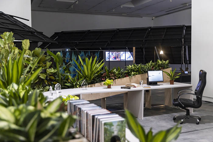 藝術家何銳安的作品主要探討在全球化時代,不同治理體系中勞工、技術與資本之間的關系。在展覽現場,何銳安布置了一個充滿熱帶植物的空間裝置作品——《花園中的石油城遠景》。何銳安認為,公眾對新加坡通常印象是花園城市,鮮有人知道新加坡是全球石油樞紐這一事實。這件作品正是通過一個虛構的石油高管的辦公室中擺放的物品、書籍、影像與視頻展現了新加坡在煉油、存儲、分銷及石化產業中的角色,例如辦公桌上的電視機播放的正是新加坡附近海灣中的油輪。藝術家通過作品反映了石油生產與分銷過程中所涉及的“腦力勞動”形式。