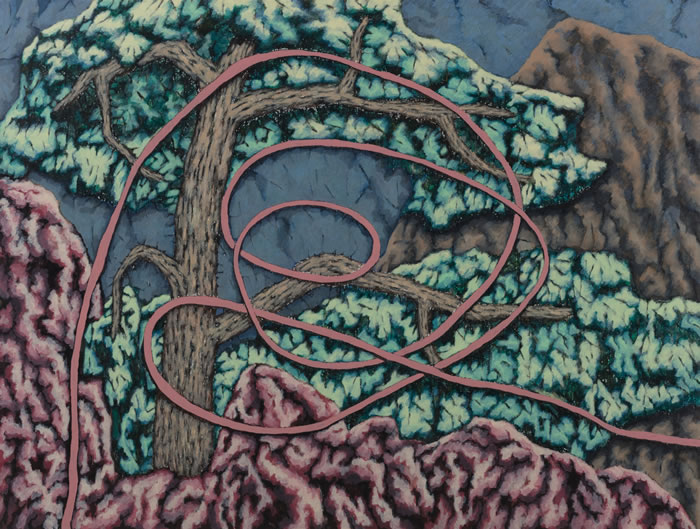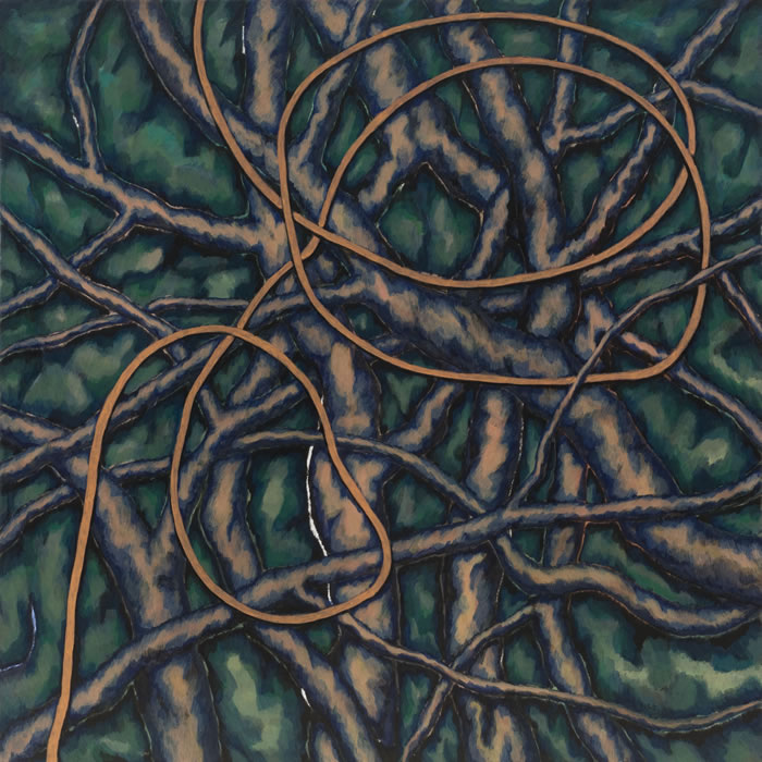 李滿金作品中的空間感也在十幾年的創作過程中逐步嬗變。以“叢林”系列中穿插的繩索為代表,繩索在實際的景物與觀者的視覺之間開辟出另外一層空間。這是很妙的一種處理方式,因為有了這層空間,藝術家不再是直接描繪眼之所見的物象,她可以向記憶深處尋找與她有著更深情感鏈接的事與物;亦可使用更廣泛的繪畫語言。對于觀者來說,觀看李滿金的作品也有了緩沖地帶,觀者有空間與時間調動自身回憶與藝術家的作品有更深鏈接。繩索背后的、糾纏著的、穿插著的樹枝退到了下一層的空間中,它們即使相互糾纏依然具有整體性,有條不紊。然而李滿金的這種處理方式卻來源于一次偶然性的被破壞,她發現幼子在她的手稿本上亂畫,憤怒與焦躁之余,卻發現了另外一種畫面塑造中的空間表達的可能性?!皡擦帧毕盗懈袷且环N隱喻,畫面之后仿佛是藝術家生活的紛雜,而這種有條不紊的雜亂正是她創作的源泉。生命的饋贈往往令人感嘆。