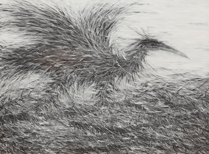 李:2009年開始的碳筆系列大量是用皴擦揉的方式來處理的,畫禿了很多油畫筆。我主要想讓碳筆吃到畫布里面,而不是浮于表面,確實跟中國畫里的皴法有點像。留白主要是兩點考慮:一來是我在紙本上的作品就是有很多留白,當時我是用手指、墨、碳筆等這些材料畫的,很放松,我希望把這種感覺在布面上也呈現出來。另外,是與傳統的反叛,我就是要有意留白把邊沿線凸顯出來。