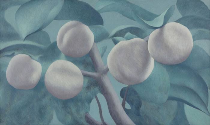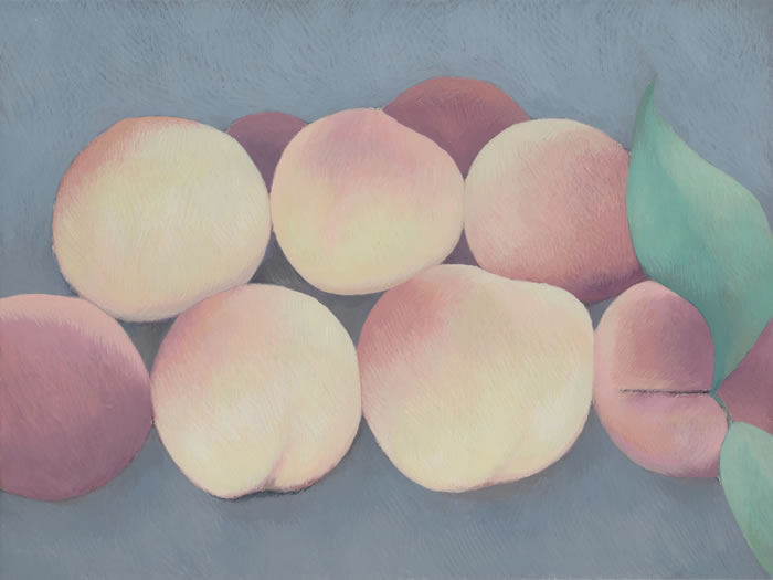 梁:我非常喜歡你最近一個系列的作品,“果實”系列。果實的指向性并不強,很難辨認出是桃子還是杏子——我想這也不是你要強調的。它的塑造的感覺更加強烈了,用小筆層層描繪,不同于以往的水性感的薄,畫面效果敦厚扎實?!肮麑崱毕盗械倪吘壱膊⒉涣舭?,構圖與色調格外和諧。也是在這個系列中看到了你不同以往的色彩感。