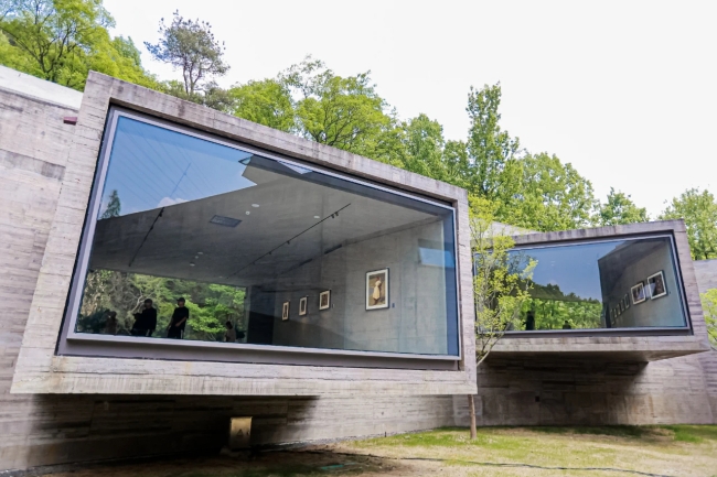 在這座凝練傳統與當代的藝術新坐標,肖峰藝術館以系統性典藏、研究與展示肖峰宋韌的畢生創作為核心使命,深度梳理中國現當代美術發展脈絡。藝術館由國際知名建筑設計師張軻設計,歷時十一載精心營造。西子之畔,湖山靜美,這座建筑如雕塑般凝練,如詩性般壯美,張軻以解構主義手法詮釋“混凝土橋”意象,通過懸浮式懸挑結構與沉浸式觀展動線,重構傳統空間美學。藝術館以“橋”為建筑母題的設計語言,恰如其分地隱喻了兩位藝術家的創作本質——他們從戰火歲月到和平年代的精神旅程,正是中國現當代美術發展歷程中承前啟后的關鍵橋梁,兩位藝術家的作品在空間中相得益彰,自然與人文的詩意表達形成視覺共振。