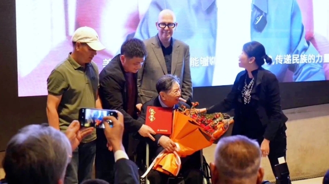 肖峰家屬代表肖戈向杭州市委常委、宣傳部部長黃海峰提交肖峰宋韌作品捐贈目錄,杭州市委宣傳部部長黃海峰向肖戈頒發捐贈證書