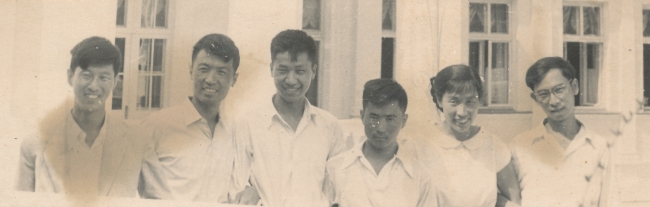 1957年的同學合影。左起:肖峰、林崗、全山石、譚永泰、晨鵬、伍必端。(羅工柳拍攝)