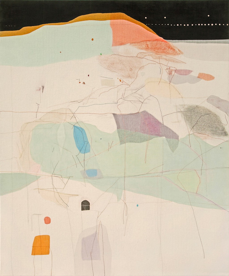 基礎日常的戶外寫生是田召亭“風景”創作的題材土壤,他將“風景”視為一種“文化傳達媒介”,真實與幻象并行。因“感受”起念開畫,而后追隨繪畫的邏輯走向一種含蓄內斂的帶有未知感的世界。丙烯透明色再加上紗布,它們的結合讓慣常的城郊風景被暖化,顏色感透氣而舒展,好似溫潤了城市化和工業化的一部分冷酷。多層畫面疊加,生成時空錯置??M繞的飄渺感,將視覺的記憶拉向遠方或者遠古。