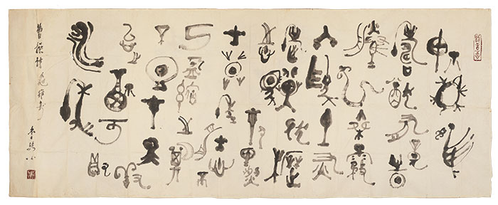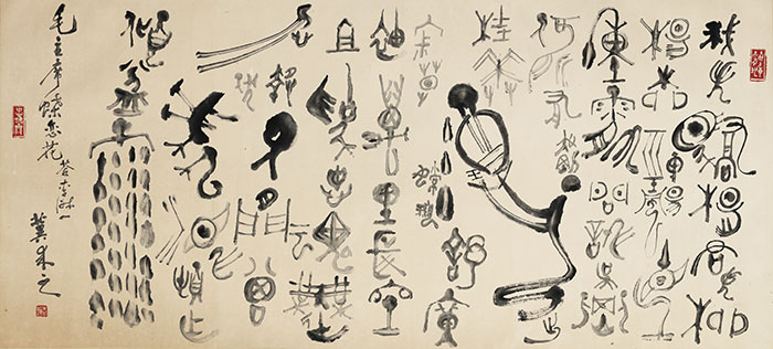 在張郎郎看來,李駱公的篆草書法將中國古代甲骨文和象形文字,包括古代壁畫、巖畫上刻的字演化為一種新的裝飾文字和書法樣式,其中既蘊含著深厚的古代藝術學養,又有非?,F代的創新意識?!皬谋砻嫔峡?,李駱公先生的篆刻書法好像與我父親張仃先生的焦墨山水完全是兩回事,但他們實際表現的都是藝術無止境的探索精神,他們都在自己的道路上探索,能夠走到哪是哪,走著走著發現柳暗花明又一村,這就是他們一生奮斗過程的寫照?!?/p>