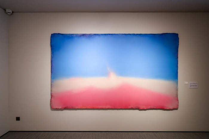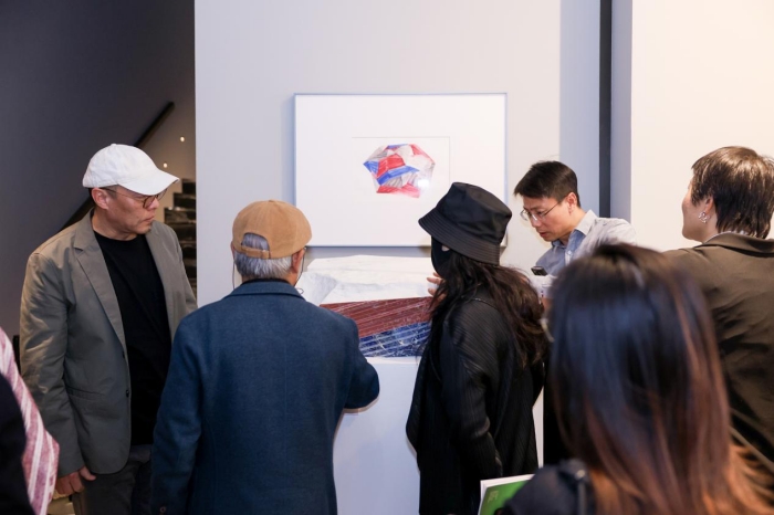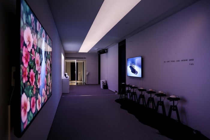 值此展覽啟幕之際,藝術家以特定場域創作介入新興文化空間,重構作品、建筑、觀眾的多維對話。藝術家隋建國用一面白色展墻連接空間與想象,巧妙地與藝術中心的在地構成互文關系。藝術家陳琦的套色版畫將櫻花的初綻與藝術中心的開館并置,這種時空疊印的意象組合,既承載著東方美學的瞬時性哲思,又暗合文化場域生成的儀式感。藝術家馬浚誠的《若花·序章》借用了花的形態和語言,裝置會隨人的腳步行近時綻放,遠離時收合,仿佛身體器官一樣自在呼吸,演繹著數字時代的生命節律。