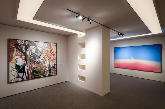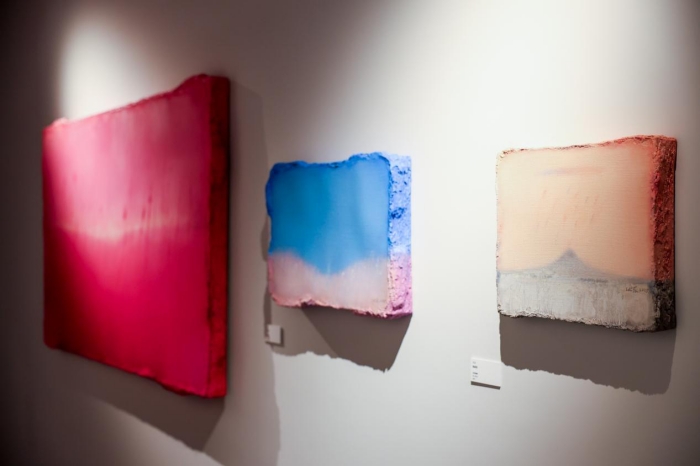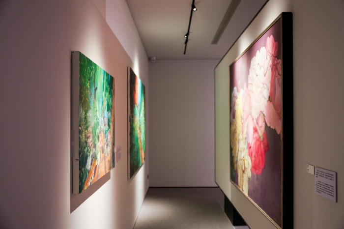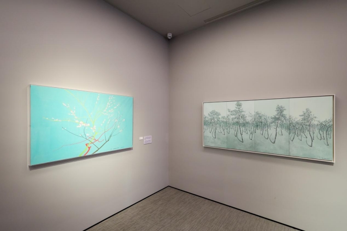展覽現場(從左至右):藝術家陳琦的作品《櫻花》;藝術家范勃的作品《林中路7》