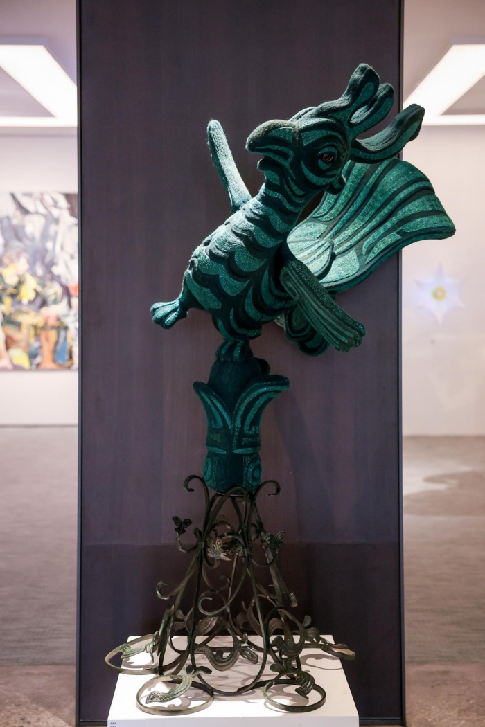 展覽現場,藝術家張煜東的作品《青銅鳥》