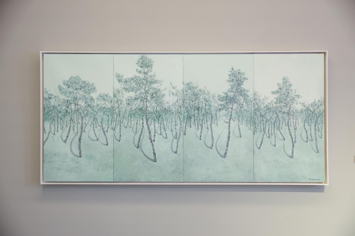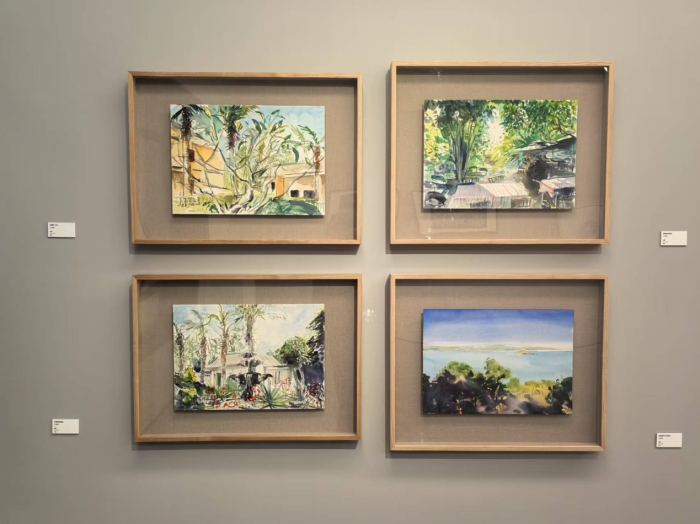 展覽現場(從上至下,從左至右):藝術家王少軍的作品《枝繁葉不茂》、《潿洲島的陽光》、《有噴泉的花園》、《陸地的盡頭見海洋》