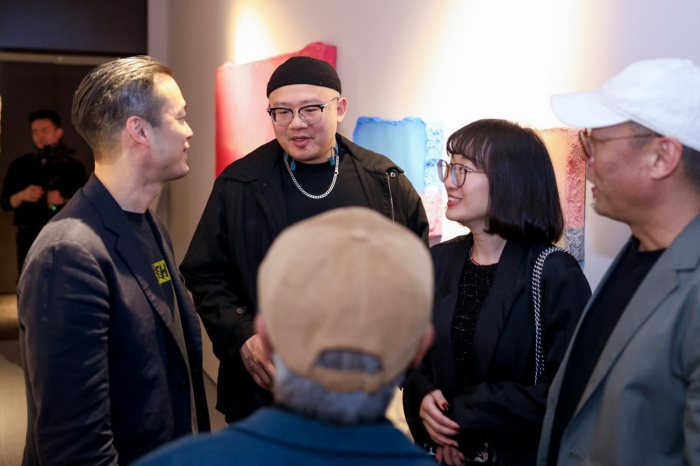 觀展現場,左起:藝術家康蕾、藝術家蔣煥、藝術家張煜東、藝術家陳淑霞