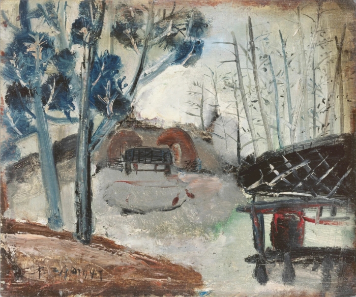 趙無極,《無題(寺廟和墳墓)》,1947年,布面油畫,45.5 × 55 cm,杭州,中國美術學院美術館藏,弗朗索瓦茲·馬爾凱-趙捐贈,2024年,圖片來源:Dennis Bouchard