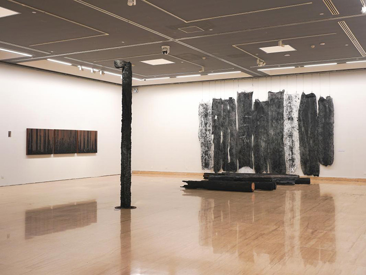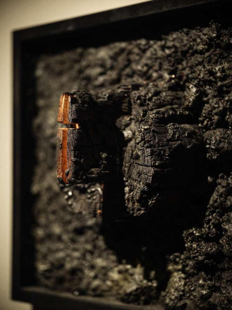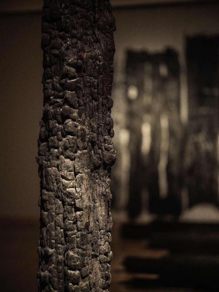 其作品兼具了現代性創傷的文化療愈。城隍廟作為民間信仰的載體,其毀滅象征傳統文化在現代化進程中的邊緣化。梅法釵通過焦木的再創作,將廢墟轉化為“文化考古”的現場,如《燼·系列1》以布面拼貼炭木碎片,形成歷史檔案般的視覺結構。這種創作方式與德國藝術家安塞姆·基弗(Anselm Kiefer)對戰爭廢墟的反思異曲同工,但梅法釵更強調本土文化基因的延續性,試圖在物質廢墟中重建精神家園。梅法釵的焦炭承載著具體的地方文化記憶,具有敘事性與象征性,以及“物與空間”的關系。