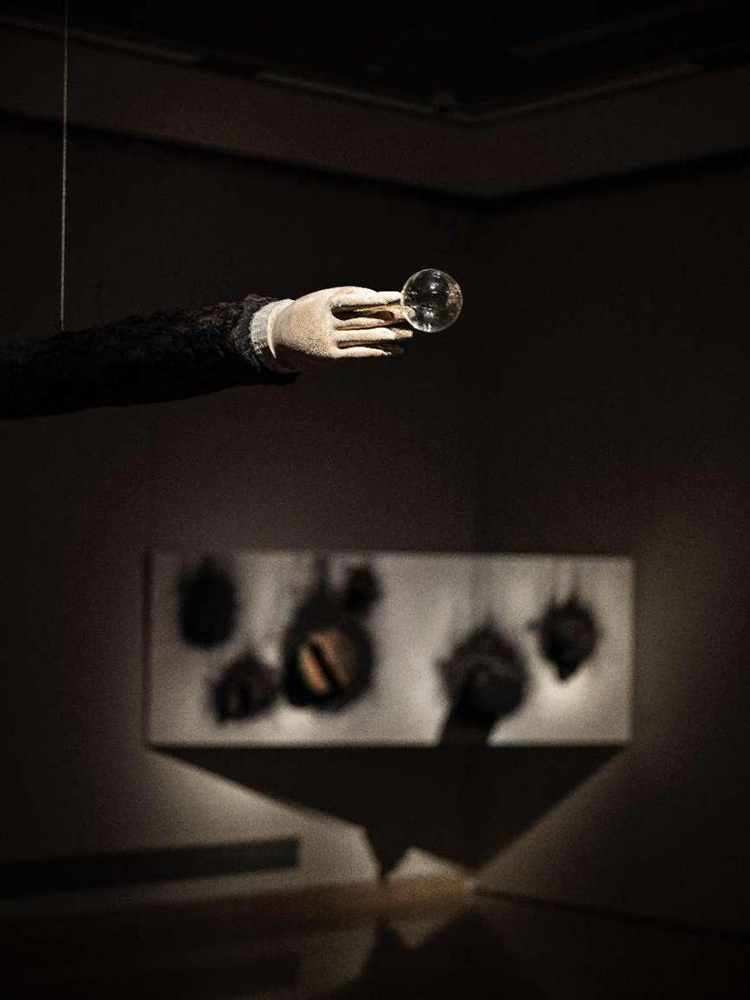 梅法釵的“燼”系列作品焦炭化的手臂作為主體,是物質衰變的終極形態——木材經火災后碳化的殘骸,既保留著原始有機生命的形態輪廓,又因高溫灼燒而凝固為無機物的“死亡標本”。焦炭的黑色肌理、粗糙質地與脆弱結構,暗示著歷史創傷(如臺州城隍廟火災)、個體生命消逝(如母親病重)等現實層面的斷裂。而玻璃球的光滑表面、透明質感與折射出的斑斕色彩,則與焦炭形成尖銳對立:玻璃作為工業化產物,其熔融重生的物理特性(高溫下液態流動,冷卻后固態定型)隱喻著涅槃的可能性;球體本身的幾何完美性又暗含宇宙秩序與精神永恒的象征。