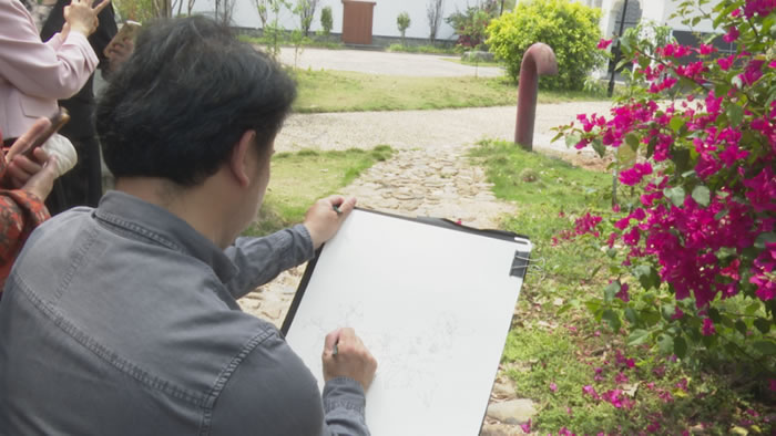 在采風現場,畫家們各自找到了心儀的創作角落。有的坐在古厝前,仔細描繪著古建筑的滄桑與韻味;有的則被院子中的三角梅所吸引,用畫筆捕捉著花朵的絢爛與生機;還有的坐在大門前,勾勒出大門的雄偉與莊重。他們或低頭沉思,或揮毫潑墨,將平和的美景和人文風情一一呈現在畫布上。