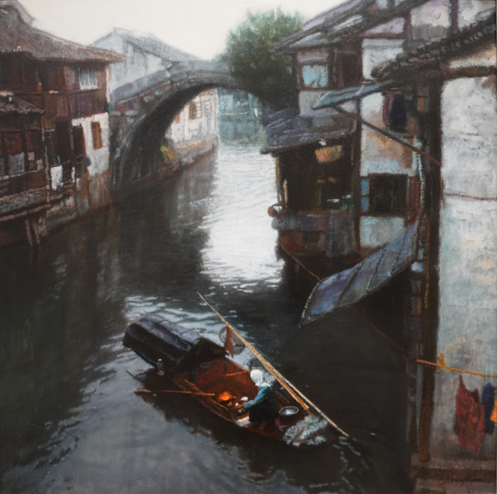 陳逸飛是最早被國際藝術界認可的中國當代油畫家之一,但被西方主流藝術界認可并不是陳逸飛的最終追求。在回歸故土后,陳逸飛依然在創作精進。比如,他繼續進行的《周莊》系列、《海上舊夢》系列。也正是《海上舊夢》,讓陳逸飛以自己的視角觸碰到老上海的靈魂,而不再純粹只是展現嫻熟西方古典油畫技巧的畫家。畫面中的元素不僅是歷史符號,更是“上海人”精神密碼的載體。他通過電影與繪畫的雙重媒介,將“十里洋場”的浮華升華為一種文化自覺,為上海的城市敘事提供了美學范式。